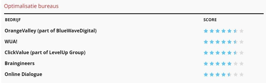 In de categorie ‘Optimalisatiebureaus’ behalen we net als vorig jaar 5,5 sterren, waarmee we net als vorig jaar een gedeelde eerste plek scoren. Een schitterende beloning voor het werk van onze collega’s! We danken onze klanten voor het vertrouwen en de fijne samenwerkingen die onze resultaten mogelijk maken!