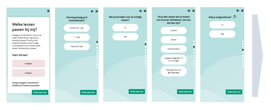 During the first period of the pandemic the Dutch Pearle stores closed due to government regulations. Sometimes an appointment could be made, but not always as restrictions varied over time. To be able to service people better online, a lenses selection tool was made to help people choose the correct lenses. The tool was made together with specialists containing multiple questions to verify what specific type of lenses would apply to specific eye needs. After walking through 9 questions customers received a list of the lenses that would fit their own situation.