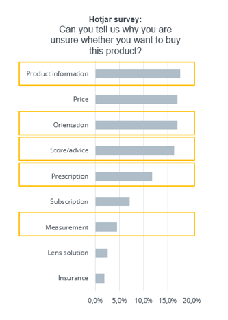 Additional research was done to see if the opportunity was big enough to prioritize in the opportunity backlog. From a Hotjar exit survey we saw many users having trouble finding the right lenses, or having trouble understanding the lenses attributes and words that are used.