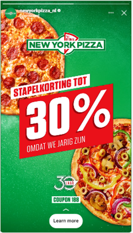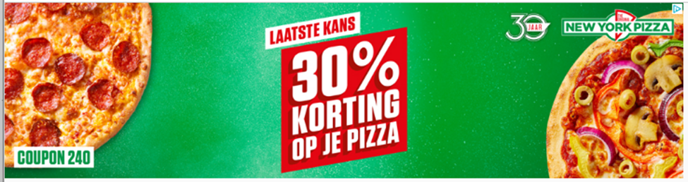Afbeelding 4 t/m 7: Consistentie in New York Pizza advertenties over verschillende kanalen heen.